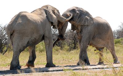 Im Jahr 2005 lebten 3.009 Tiere im Nationalpark. Wir haben im April nur 4 davon gesehen. Während der Regenzeit halten sich die Etosha-Elefanten normalerweise nicht an den permanenten Wasserlöchern auf, da die Vegetation rundum während des ganzen Jahres stark beansprucht wird. Am Tsumcor-Waterhole hatten wir Glück und konnten trinkende Bullen beobachten. Es kam sogar zu einer kleinen Rangelei.