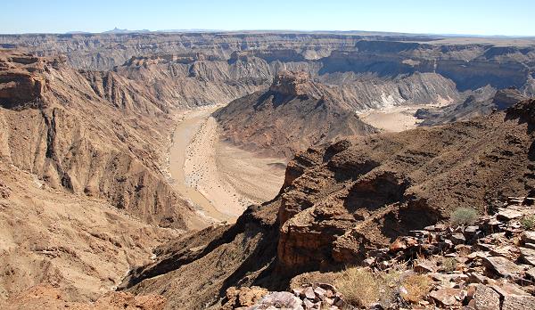 Der Fischfluss Canyon ist etwa 160 km lang, bis zu 27 km breit und 500 m tief und von den Aussichtspunkten aus überblickt man immer nur einen kleinen Teil. Ein paar Schleifen mit braunem Wasser, sandige Ufer, steile Felswände und vor allem hört man die Stille. Nur der Wind macht hier Geräusche, sonst erscheint alles wie ausgestorben. Mit dem Fernglas konnten wir unten am Flussbett sogar ein paar wilde Pferde erkennen, die den üppigen Wasserstand genossen, und ab und zu kreiste ein Raubvogel hoch über unseren Köpfen.