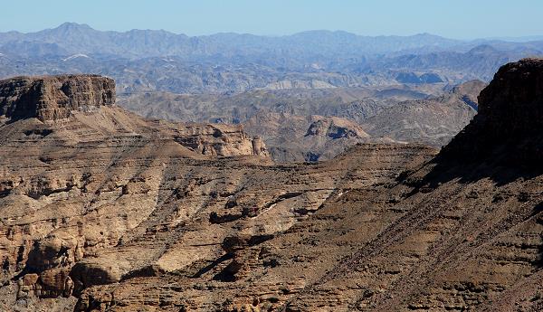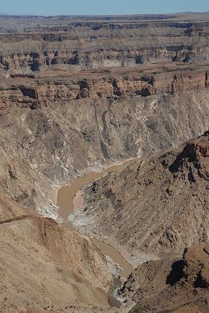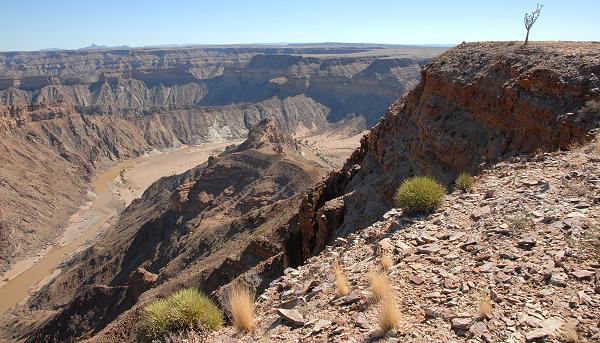 Wie entstand der Canyon? Vor 350 Millionen. Jahren sank überall dort, wo es Rissen in der Erdkruste gab, die Oberfläche ein. So entstand ein 20 Kilometer breiter Graben, der noch heute zu erkennen ist. Dort flossen dann die Wasser vom Fischfluss und da es hier nur ein geringes Gefälles gab, zog er weite Schleifen durch die Landschaft. Vor 120 Millionen. Jahren brach dann der Urkontinent Gondwana auseinander. Die Ränder des afrikanischen Bruchstückes hoben sich langsam und die Flüsse fraßen sich von der Mündung her immer tiefer ins Erdreich. So bildete sich langsam aus dem ehemals flachen Mäander nach und nach das gewundene und tiefe Schluchtensystem, welches wir heute noch bestaunen können. Am eindrucksvollsten ist es sicherlich aus der Luft oder auf Satellitenaufnahmen zu erkennen. Aber es ist dennoch ein einmaliges Erlebnis, oben an der Kante zu stehen und unvermittelt in die Tiefe zu schauen, so wie es an den diversen Aussichtspunkten möglich ist. Am besten sind die Lichtverhältnisse am Mittag, wenn die Sonne senkrecht steht und alle Ecken gut ausleuchtet. Zum Sonnenuntergang ist es sicherlich sehr stimmungsvoll, aber zum fotografierenist das Licht auf Grund der langen und tiefen Schatten ab Nachmittag dann weniger geeignet.