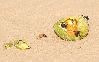 Die zahlreichen Käfer der Namib leben nicht nur von Silberfischen, sondern auch von Pflanzen wie den Wüstenmelonen. Diese Wüste hat einen großen Insektenreichtum - mehr als andere Wüsten auf der Erde. So leben hier alleine 200 verschiedene Schwarzkäfer-Arten. Der Onymacris unguicularis oder Nebeltrinker-Käfer ist der berühmteste. Er überlebt, indem er sein Hinterteil in den Nebel hält und die am Körper kondensierten Tropfen schluckt.