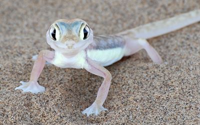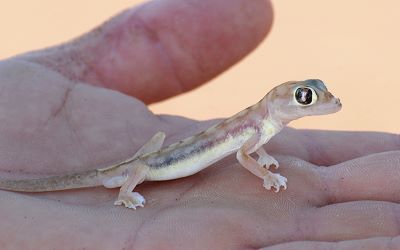 Besonders niedlich, aber schwer zu finden, ist der Wuestengecko oder auch Schwimmfußgecko (Pachydactylus rangei). Tagsüber sitzt er unsichtbar tief im Sand, denn vierzehn Zentimeter unter der Oberfläche ist es etwa 14°C kälter. Erst in der Nacht wird er aktiv. Palmatogeckos werden bis zu 14 cm lang, sie sind fast durchsichtig und einige innere Organe kann man durch de Haut sehen.