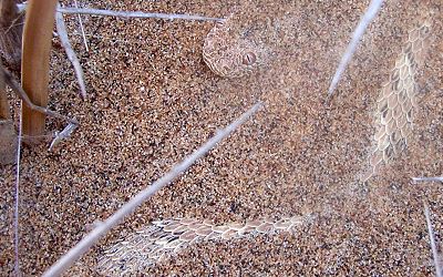 Auch die Afrikanische Radspinne (Carparachne aureoflava), auch "Weiße Tänzerin" genannt, lebt tagsüber unter dem Sand. Als wir in die Wüste gingen, war es ungewöhnlich heiß und ohne Nebel. So zeigte uns Chris nur den Eingang zum Versteck der Spinne, die tarnen ihre 50 cm tiefen Höhlen mit einer sandbedeckten Klappe aus Spinnenfäden. Hätten wir sie augegraben, wäre dies ihr Tod gewesen, denn sie braucht 8 Stunden, um für eine neue Höhle ein neues Netz zu spinnen, welches den weichen Sand stabilisiert.