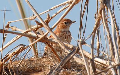 Die scheue Rotdünenlerche (Calendulauda erythrochlamys) ist der einzige 100%ige Endemit Namibias. Man findet sie im Kuiseb-Delta südlich von Walvis Bay, wo sie in einem recht kleinen Verbreitungsgebiet lebt. Unser Guide lockte dieses Exepmplar an einer passende Stelle ganz clever mit Dünenlerchen-Gesang vom MP3 Player an. Sofort kam ein Pärchen zum Verteidigen seines Reviers angeflogen. Alleine hätten wir das scheue Vögelchen wahrscheinlich nie gefunden. Dünenlerchen sind Bodenbrüter und der Gesang dieser Rotmäntelchen ist sehr schön.