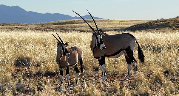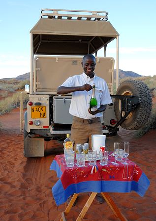Wir starteten zu sechst am frühen Abend vom Dune Camp mit unserem Fahrer und Guide Ben, nicht ohne vorher nach den Getränke-Vorlieben zum Sonnenuntergang gefragt zu werden. Wir entschieden uns für unseren Sunset Standard, einen Gin Tonic. Die beiden anderen Deutschen hatten das Gleiche, die Italiener tranken lieber Sekt. Gut ausgestattet mit Getränken führte die Fahrt dann ca. eine Stunde lang vom Dune Camp aus durch die Wildnis. Unterwegs sahe wir einige Oryx Antilopen und Springböcke. An der Kante des Dünengürtels waren dann schon einige Plätze von anderen Gäste mit ihren Guides besetzt und wir mussten weiterfahren. Kurz vor Sonnenuntergang erreichten wir eine hohe Düne und Ben begann sogleich mit der Ausgabe der Getränke. Dazu gab es ein wenig leckeres Fingerfood, gut für den kleinen Hunger.