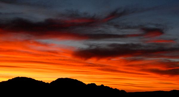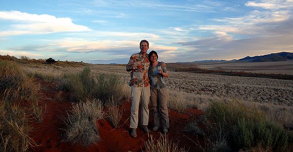 Danach verteilten wir uns in den Dünen und genossen still das immer wieder einmalige Naturerlebnis. Auch in diesem Urlaub hatten wir ja schon einige Sonnenuntergange gesehen, die Aussicht und die Lichtstimmung hier im Naturreservat waren allerdings unvergleichlich. Kein Lichtpunkt so weit das Auge reicht, keine anderen Menschen, keine Strommasten oder sonst wie störende Anzeichen der Zivilisation. Dazu ein paar Wolken, die so einen Sonnenuntergang ja erst interessant machen. Die Italienerin zog ihre Schuhe aus und lief Barfuß durch den Sand, ein echtes Wagnis in einer Welt mit Schlangen, Dornen und Skorpionen. Eine dicke, harmlose Dünengrille hat Bend dann gefangen und herumgezeigt, da waren die Schuhe schnell wieder an den Füßen... :-)