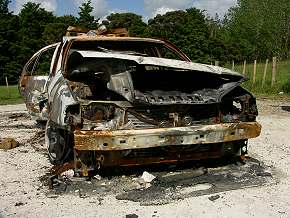 Wir folgten dem State Highway 16 in Richtung Helensville. Unterwegs überholten uns mit hoher Geschwindigkeit volle und leere Holzlaster, viel Wald war allerdings nicht auszumachen. Die Landschaft bestand hauptsächlich aus grünen Hügeln mit Weidewirtschaft und engen, kurvenreichen Straßen. An einem kleinen Rastplatz bogen wir ein und fanden dort ein ausgebranntes Autowrack als skurriles Fotomotiv. Drei wunderschöne Hähne kamen im Eiltempo angerannt und bettelten um Futter. Sie hatten sich schon an die Anwesenheit von Futterspendern gewöhnt und waren teilweise sogar recht aufdringlich. Als sie am Ende gar versuchten, in den Camper einzudringen, führen wir weiter