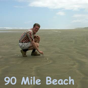 Der Name ist verwirrend, denn in Wirklichkeit ist dieser Strand nur 63 Meilen - also 90 Kilometer - lang. Was eher egal ist, der 90 Mile Beach hat Kultstatus und sogar eine eigene Webseite. Die meisten Busse biegen nach einem Besuch des Lighthouse am Kap bei Te Paki zum Strand ab und fahren dann bis kurz vor Waipapakauri, wo sie wieder zurück zur Hauptstraße 1F gelangen. Oder umgekehrt, das hängt von den Gezeiten ab. So sparen sie sicher mehr als eine halbe Stunde Fahrzeit, und die Gäste bezahlen auch noch für das "Abenteuer".