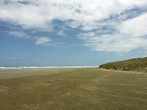 Da es für uns verboten war, am Strand entlang zu fahren, bogen wir kurz vor Waipapakauri in eine Nebenstraße ab. Die ersten Kilometer waren asphaltiert, dann folgte eine gut befahrbare Gravel Road die wohl hauptsächlich von Holzlastern und Tourbussen genutzt wird. Am Wegrand breitete sich gezirkelter Nadelwald aus. Kurz vor Erreichen des 90 Mile Beach wurde die Straße sandig, wir parkten in der Nähe der Düne und liefen die restlichen 40 Meter zu Fuß.
