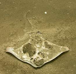 Schon vor dem Betreten des Strandes meinte ich scherzhaft zu Michael: "Bestimmt fahren dort unten jetzt die Tourbusse wie auf einer Autobahn hin und her". Fahrspuren fand man auch einige im Sand. Tatsächlich, kurz nach Erreichen der Wasserlinie bemerkten wir fern im Dunst 2 helle Lichtpunkte, die schnell größer wurden. Es handelte sich natürlich um einen Fuller-Tourbus, der sich mit hoher Geschwindigkeit näherte. Beim Vorbeifahren sah man die Insassen fröhlich winken, wahrscheinlich freuten sie sich über die winzigen Menschlein am endlosen, leeren Strand.