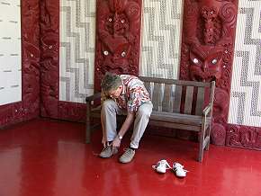 Hauptattraktion ist das Te Whare Runanga Versammlungshaus, das ein Symbol für Beteiligung der Maori am Vertrag darstellen soll. Das Versammlungshaus, Marae genannt, wurde im typischen Stil der Maori Versammlungshäuser 1940 zur 100-Jahr-Feier erbaut und darf betreten und fotografiert werden. Allerdings ist es schwierig, es ohne Reisegruppen abzulichten. Die Besonderheit: Dieses Marae gehört keinem Stamm alleine, sondern allen Maoris gemeinsam. Man könnte Romane über die geschnitzte Einrichtung und ihre Bedeutung schreiben, aber alles Wissenswerte wird ausführlich im Informationsblatt "Waitangi carved Meeting House - Whare Runanga" erklärt, welches man am Eingang kostenlos erhält. Der Fahnenmast auf der Wiese davor markiert die Stelle, an welcher 1840 der Treaty of Waitangi unterzeichnet wurde.