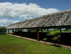Our Birthplace - Te pitowhenua - so nennen die Neuseeländer stolz diesen Ort. Der Rundgang führt zuerst zum Kanuhaus, in dem sich ein 35,7 Meter langes Maori Kriegskanu befindet, das 76 Ruderern Platz bot und somit wohl das längste Zeremonien-Kanu weltweit ist. Es ist bis zu 2 Meter breit, wiegt 12 Tonnen und ist mit schönen Schnitzereien bedeckt. Die geschnitzten Gesichter haben Augen aus Paua Muscheln. Das Kanu war Teil der Feiern zum 100-jährigen Bestehen des Vertrages im Jahr 1940. Kanu heißt Waka in Maori und dies ist das Waka Ngatokimatawhaorua. Es wurde benannt nach dem Kanu, das die ersten Maoris aus Polynesien brachte. Häuptling darauf war Nukutawhiti, der Enkel von Kupe, dem Entdecker von Neuseeland. Ganz in der Nähe befindet sich die Rampe, wo es jährlich am 6. Februar zu Wasser gelassen wird. Die Paddel hängen unter dem Dach und am Ende des Hauses kann man noch die traurigen Reste eines riesigen Kauribaums als Stumpf betrachten.