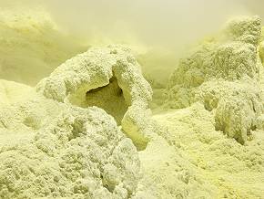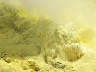 Besonders fotogen sind die quietschgelben Schwefelablagerung am Austrittsloch, hier haben sich großflächig leuchtend gelbe Schwefelkristalle gebildet. Der Chemiker nennt das Sublimieren, wenn der gasförmige Schwefel ohne flüssiges Stadium direkt in den festen Zustand übergeht.