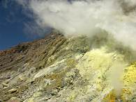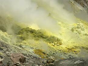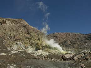 Die Fumarolentätigkeit ist auf White Island ausgesprochen stark, und die reichlich ausgeschiedenen Schwefelablagerungen wurden schon im Laufe des 19. Jahrhunderts von einer Schwefelmine gewerbsmäßig abgebaut. Auf dem Rundgang kommt man der mächtigen Dampfwolke auf der linken Seite des Kraters sehr nah. Es gibt noch einige kleinere, aber diese ist wirklich beeindruckend. Vor allem, wenn sich der Dampf vor stahlblauem Himmel ohne Wolke prächtig abhebt und der Wind damit spielt und ständig neue Formen ezeugt. Ab und zu wird man komplett eingenebelt wenn man davor steht. Je kälter es ist, um so mehr Dampf wird durch kondensieren sichtbar.