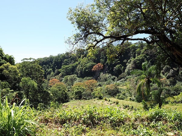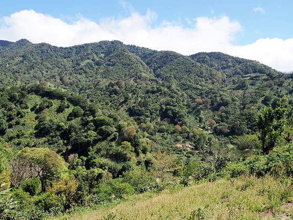 Wir hatten jetzt auch keine Lust mehr. So ein Gedöns und null Info, nur um ein paar Kiometer da oben in den Wald zu laufen. Da hatten sich die Tage in der Regenwald-Lodge mit Zugang zu etlichen Kilometern Wanderwegen für uns schon gelohnt. Also sind wir auf der anderen Seite der Straßenschleife zurück zum Ort gefahren und haben noch einmal die Ausblicke auf die Kaffeefelder weiter unterhalb genossen.