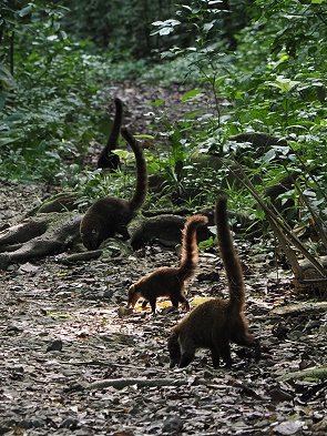 Später hatten wir dann noch merh Glück und eine ganze Bande Kapuzineraffen kam oben in den Baumkronen entlang und überquerte auch den Wanderweg. Sie leben ebenfalls in Gruppen von ca. 10 bis 20 Tieren – Weibchen, Jungtiere und ein oder mehrere Männchen. Der frühe Morgen ist Futterzeit – sie durchstöbern das Blätterdach, suchen nach Früchten, Insekten, kleinen Wirbeltieren oder Eiern. Manchmal klettern sie auch in niedrigere Sträucher oder gehen zum Bach hinunter, dann kann man sie noch besser fotografieren.