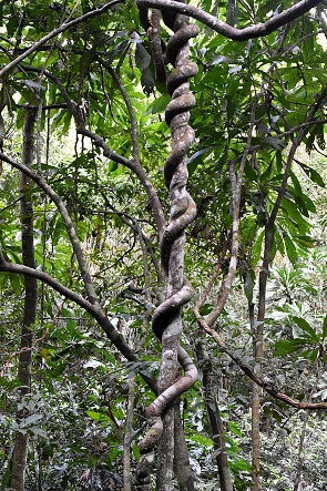Den ersten Teil läuft man durch wunderbaren Wald mit ziemlich hohen, alten Bäumen. Der meist flache Weg mit leichter Steigung führt über kleine Holzbrücken, auf dem weichen Waldweg geht es sich prima. Wären da nicht die tropische Hitze und die enorme Luftfeuchtigkeit, die einem hier das Wandern schwer machen.