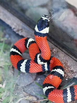 Als erwachsene Tiere sind diese Schlangen überwiegend schwarz und können bis zu 1,5 Meter lang werden. Dieses kleine Exemplar unten auf dem Foto ist ein Jungtier mit einem Farbmuster, das eine hochgiftige Korallenotter nachahmt. Dies schützt sie vor Fressfeinden, da viele Tiere die giftige Schlange meiden.
