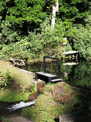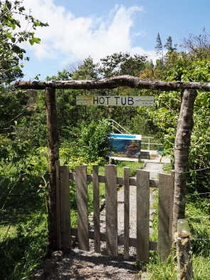 Am Weg zwischen dem Coffee House und der Bellbird Lodge führt jetzt ein Tor zu einem Gartenbereich mit einem neu gebauten Hot Pool. Der wird ständig durch den überschüssigen Strom der eigenen 7,5 kW-Wasserturbine erhitzt und ist sicher eine Wohltat nach einer langen Wanderung. Leider war er bei unserem Aufenthalt nicht besonders warm, da viel Strom für die Kaffeeernte und Produktion gebraucht wurde und somit kaum überschüssige Energie vorhanden war.