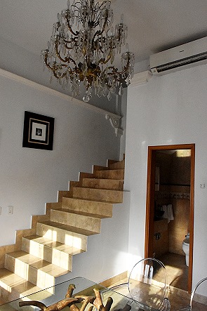 Der Schlafraum auf der ersten Etage ist groß, mit einem wunderbaren King Size Bett und einer gegenüber liegenden Ecke mit Schränken. Dazu ein Schreibtisch und angrenzend das Marmorbad mit einer riesigen ebenerdigen Dusche und Glastüre. Schön auch die indirekte Bleuchtung der wunderbar restaurierten Decke, unten auf dem Foto gut zu erkennen. Bademäntel, Hausschuhe und kostenlose hochwertige Pflegeprodukte liegen hier natürlich ebenfalls bereit.