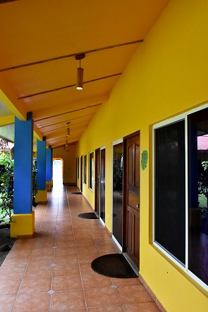 Die 12 normalen Zimmer mit Queen Size Bett liegen alle im L-förmig angeordneten Untergeschoss, die Gänge vor den Zimmertüren und Fenstern sind zum Garten hin offen. Jeder, der vorbeigeht in Richtung Restaurant, kann reinschauen. Das mögen wir gar nicht, immer bei geschlossenem Vorhang im Zimmer zu sitzen. Außerdem ist es auf dem Gang oft sehr laut.