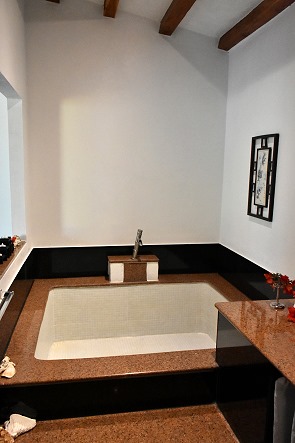 Das Bad liegt geräumig etwas um die Ecke und ist offen, nur die Toilette hat eine Tür. Es gibt einen Waschtisch mit Glasbecken, eine geräumige Dusche und eine riesige, eckige Badewanne mit kleinen Fliesen. Wir haben auf Grund der Hitze hier nicht gebadet, es hätte aber sicher auch lange gedauert, bis die große Wanne gefüllt ist.