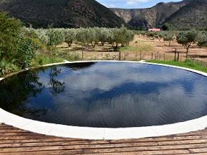 Ein weiteres Farmhaus namens Studtis Huis hat fünf Schlafzimmer und bietet Platz für bis zu 12 Personen. Ideal für Familien mit Kindern oder Gruppen. Es liegt inmitten von Beeten mit Blumen und alten Bäumen direkt neben dem Heritage Center. Ein weiterer Vorteil ist der schöne Pool, hier ist er rund und ein alter Wassertank. Man steigt ein paar Stufen zu einer Plattform mit Liegestühlen und springt dort mit Überblick auf die benachbarten Olivenhaine in die kühlen Fluten. Dies ist ein rustikaler Farm-Pool in einem alten Wasserspeicher, kein klassischer Hollywood-Pool mit blauen Kacheln wie am Landhuis.