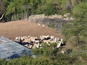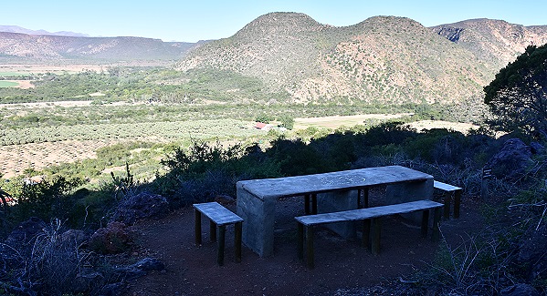 Weiter oben am Hang befindet sich der Sundowner Point namens "Plaas Stappie". Mit dem Allrad kann man ganz hochfahren, zu Fuß braucht man eine gute Stunde. Oben angekommen führt ein kleiner Fußweg zu einem Tisch mit Bank. Von hier aus hat man einen schönen Ausblick auf das Tal und die Farm unterhalb. Und natürlich einen sicher traumhaften Blick in den Sonnenuntergang. An den ersten beiden klaren Abenden hatten wir es leider versäumt hier hoch zu fahren, danach trübten dann leider der Rauch eines Buschfeuers und Wolken die Aussicht.