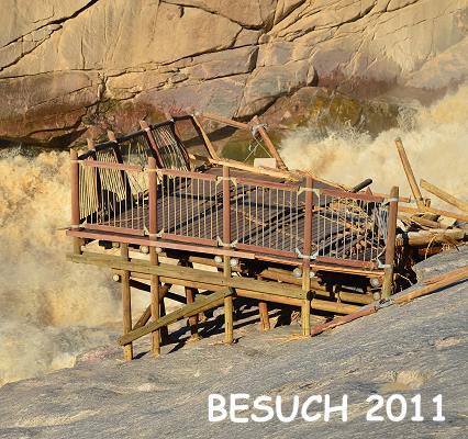 Im März 2011 waren wir wieder vor Ort, diesmal hatte es in den Wochen und Monaten zuvor noch viel heftiger geregnet als 2010. Die Staudämme im am Oberlauf des Oranje mussten geöffnet werden und das Wasser strömte in Massen. Selbstverständlich waren auch die Wasserfälle in diesem Jahr noch viel gewaltiger, das erste Video aus dem Monat Februar zeigt die ganze Gewalt der Wassermassen. Dort kann man schön sehen, wie sich das Wasser seinen Weg von hinten über die Felsen bahnt und gerade eine der hölzernen Aussichtsplattformen mit sich reißt. Die Brücke in Kakamas war überflutet und zeitweise konnte man den Park gar nicht erreichen. Die Durchflussrate erreichte 5.300 Kubikmeter pro Sekunde. Das war der höchste Wasserstand seit der großen Flut von 1988.