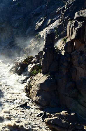 Neu für uns waren die beiden zarten Wasserfälle auf der gegenüberliegenden Seite der Schlucht, die wir ein Jahr zuvor nicht gesehen hatten. Das waren die Reste der Flut, welche von dem Flussbett des Oranje River oberhalb der Fälle nicht aufgenommen werden konnte. Daher nahm das Wasser einen Weg über die Hochebene um die Fälle herum, stürzte an vielen Stellen von der Seite in die Schlucht unterhalb der Fälle und hat sich auch einen Weg um das Camp herum gebahnt, welches zu dieser Zeit wie eine Insel heraus ragte. Das Wasser des Flusses war auch jetzt immer noch viel brauner, weil es viele Sedimente transportierte.