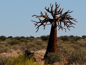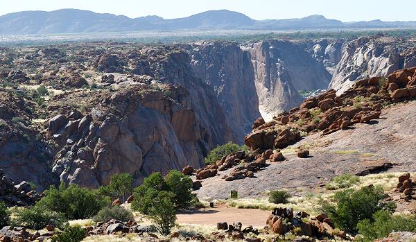 Der Nationalpark rund um die Augrabies Wasserfälle liegt 120 Kilometer westlich von Upington, dem Versorgungszentrum der Region. Dort, ganz oben im Nordwesten von Südafrika, findet man ausgedehnte Felder, auf denen hauptsächlich Früchte und Wein angebaut werden. Bewässert wird die intensive Landwirtschaft mit dem Wasser des Oranje.
