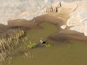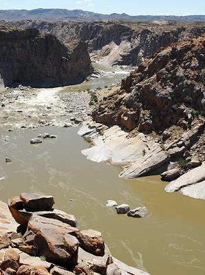 Ein wenig Pech mit dem Wasserstand hatten wir bei unserem Besuch im März 2010. Noch zwei Wochen vor unserer Ankunft stand der Pegel 7 Meter über Normal, weil in Südafrika einige Dämme nach heftigen Regenfällen geöffnet wurden. Alle diese Zuflüsse speisen den Oranje und so flossen die Wassermassen bis ins Meer bei Oranjemund und Alexanderbaii. Unterwegs rissen sie einige Uferstraßen und Brücken fort. An den Fällen entstehen durch Überflutung der Hochebene neben der Schucht dann bis zu 20 kleinere Extrawasserfälle. Der gewaltige Sprühnebel in der Luft ist in dieser trockenen Region ein ganz besondes seltenes Schauspiel.