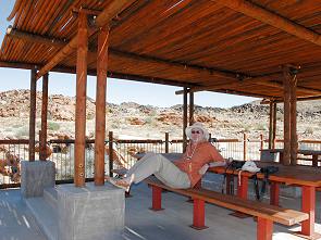 Also fährt man einen Kilometer wieder zurück, dann weitere 1,8 Kilometer zum Oranjekom. Hoch über der Schlucht befindet sich der neue Aussichtspunkt. Auf Beton mit Säulen gibt es ein riesiges, hölzernes Schattendach und darunter einige Bänke und Tische, die sich hervorragend für ein Picknick mit Rundblick eignen. Wenn man Glück hat, dann ist man hier ganz alleine.