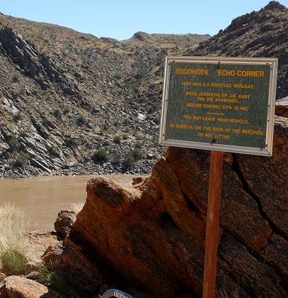 Bis zum Aussichtspunkt von Echo Corner sind es von Oranjekom und Ararat aus noch einmal etwa 8 Kilometer, unter Einbeziehung der bisherigen Abstecher hat man vom Restcamp aus etwa 22 Kilometer zurückgelegt. Diese Strecke ist schon etwas schwieriger zu fahren, Busse fahren hier nicht mehr und auch mit einem normalen PKW sollte man vorsichtig sein. Es geht erst über einen Höhenzug namens Swartrand. Warum es diesen Namen gab ist schnell zu erkennen, denn das Gestein ändert sich hier deutlich. Bisher noch meist rötlich, sind die Felsen hier tiefschwarz. Die Aussicht von der Passhöhe auf die umliegende Landschaft ist wunderschön, vor allem im richtigen Licht am Nachmittag oder am frühen Vormittag. Das quarzarme Gestein bildet hier eine natürliche Grenze zwischen der ariden Umwelt jenseits des Höhenzuges und dem fruchtbaren Gebiet auf der anderen Seite. Den Kontrast zwischen den beiden Landschaften kann man am besten hier von Swartrand aus erkennen.