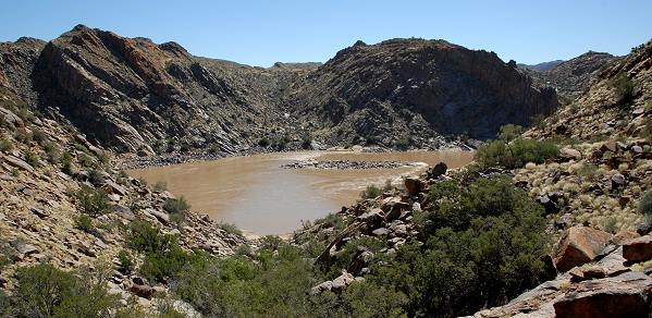 Dann erreicht man eine Abzweigung, die schmale Straße führt kurvig in ein Seitental fast bis auf die Tiefe der Schlucht des Oranje hinunter. Der Aussichtspunkt selbst ist relativ unspektakulär, man ist auch hier sicher noch hundert Meter oder mehr vom Fluss entfernt, und das Gelände rundum ist sehr steil und felsig.