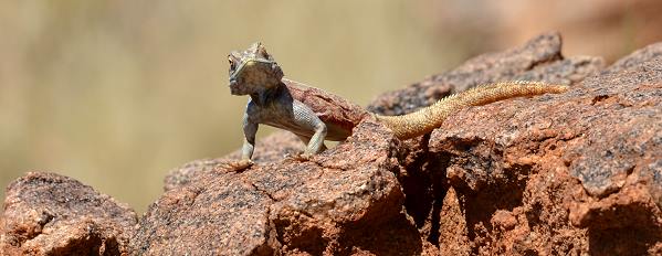 Das eigentlich Spannende hier ist aber die Anfahrt von dem Höhenzug aus. Der Weg schlängelt sich abwechslungsreich durch eine sehr aufregende Landschaft, bei der wohl nur Geologen sagen können, ob die Felsformationen durch Erosion oder Vulkanismus entstanden sind. Auf jeden Fall hat man vom Gefühl her einen sehr urweltlichen Eindruck. Man sollte diese Strecke sehr langsam fahren und genießen, da die Perspektive von oben noch schöner ist als der Rückweg. Bei Gegenverkehr hat man an den Engstellen ein Problem, wir waren hier aber immer alleine unterwegs. Auch ist das langsame Fahren besser für das Auto, denn hier ist es stellenweise schon etwas rau. Man kann mit Glück die scheuen Klippspringer, Sandflughühner oder Strauße am Wegrand sehen und auf den Felsen fliehen die Klippschliefer von ihren Aussichtspunkten.