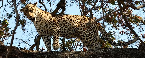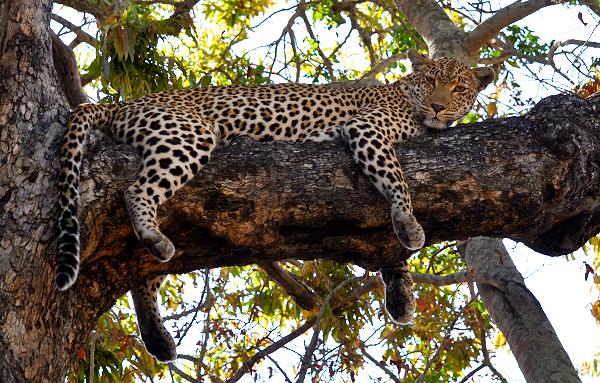 Irgendwann mussten wir uns dann doch von der Rasselbande Wildhunde trennen, denn die Tiere verließen den Weg und verschwanden in dichtem Gebüsch. Zeit für uns, nach anderen Tieren Ausschau zu halten, doch besonders viel konnten wir nicht mehr entdecken. Als wir fast schon aufgeben wollten, folgten wir gerade dem Grenzzaun auf dem Weg zurück zum Camp. Und da war sie dann: eine wunderschöne, scheinbar trächtige Leopardin namens Salayexe. Sie lag malerisch auf einem Jackalberry-Baum, so wie aus dem Afrika-Werbeprospekt.