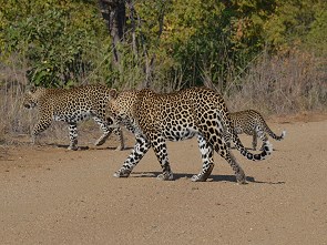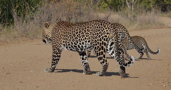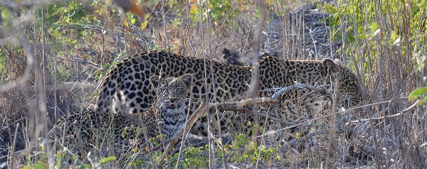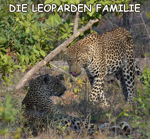 Auf Grund der Trockenheit war das Buschwerk ziemlich licht und wir konnten das Auto wenden und die Beiden eine Zeit lang begleiten. Die Leopardin legte sich hin, während er sein Revier markierte und ab und zu mal zärtlich an ihre Nase stupste. Als sie weiter liefen sah das irgendwie komisch aus und wir konnten sie immer noch verfolgen, weil sie sich parallel zur Straße bewegten. Dann kapierten wir endlich, was uns komisch vorkam: einer der Leoparden war kleiner. Die beiden hatten ihr Jungtier dort im Busch abgeholt und liefen nun zu dritt. Direkt vor uns überquerten sie wieder die Straße, diesmal ohne uns anzusehen und das Kleine war immer von einem Elternteil verdeckt.
