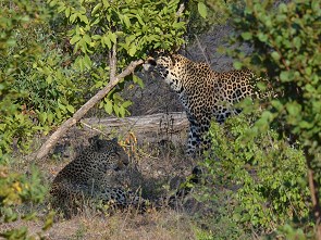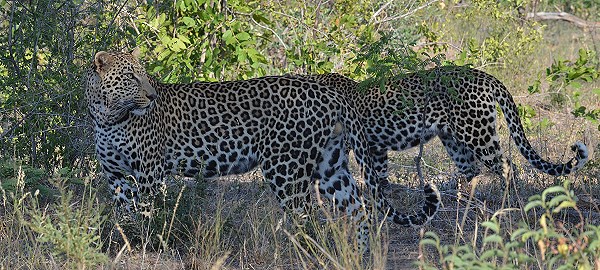 Doch dann trauten wir kaum unseren Augen: ein zweiter Leopard tauchte dahinter auf. Eindeutig kleiner und ein Weibchen. Die beiden schmusten verliebt direkt vor unserem Standort, weit und breit war kein anderes Auto zu sehen. Wir konnten die wunderschönen Tiere ganz in Ruhe beobachten, die nun über die Strasse nach links in den Busch liefen.