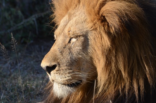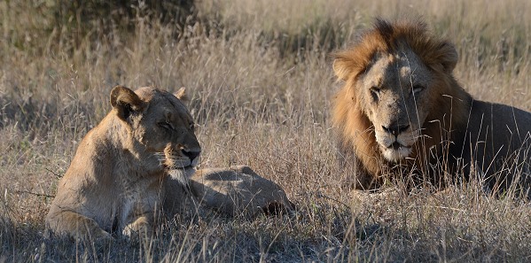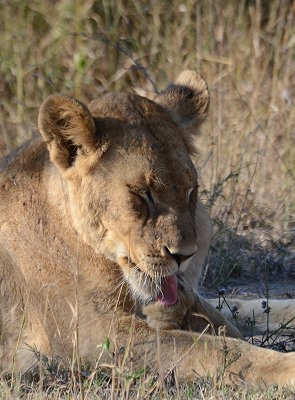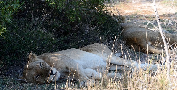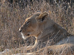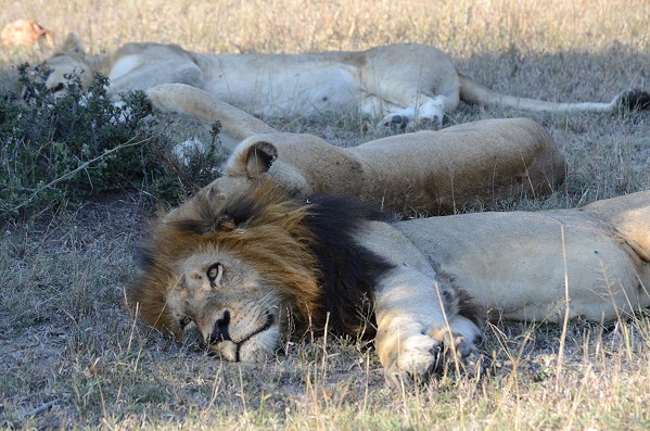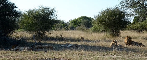 Am Anfang war es noch ruhig, ein paar Frankoline und Impalas zeigten sich am Wegrand. Als wir dann um eine Ecke kamen, lagen ein paar Löwen direkt neben dem Weg. Sie hatten ihre Jagd am Morgen schon beendet und ruhten sich nun faul im Schatten liegend von den Strapazen aus. Der Rudelführer mit seinen Damen, ein Halbstarker und ein Junglöwe. Nach einer Weile entdeckten wir etwas weiter entfernt noch weitere Tiere, die ausgestreckt im hohen Gras lagen. Insgesamt waren es neun Löwen, die ab und zu einmal träge den Kopf hoben und uns anblinzelten. Dann sank das schwere Haupt wieder zur Erde.
