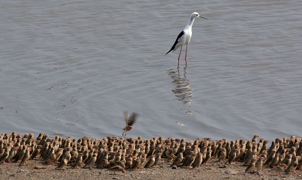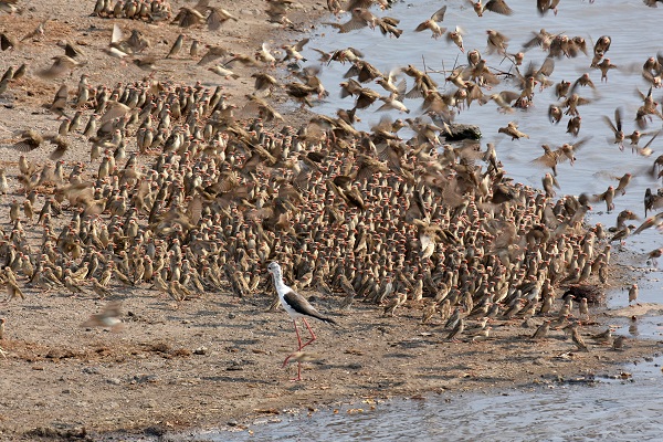 Lange haben wir es nicht ausgehalten, bei 50°C ohne Schatten die Vögel zu beobachten. Aber ein besonderes Erlebnis war diese Beobachtung schon und somikt eine Buschgeschichte wert. Denn nur zum Trinken waren sie nicht gekommen, richtig zum Wasser kamen nur wenige. Aber sie hatten sich hier am Strand versammelt, weil es dort die Seite des Sees war, wo der Wind von der Wasseroberfläche kommend wider auf das Ufer traf. Durch Verdunstungskälte war die Luft dort vielleicht 1 oder 2 Grad kühler als sonst irgendwo - bei der unglaublichen Hitze ein entscheidender Vorteil.