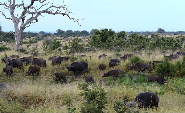 Rund um Satara sahen wir viele Elefanten, hatten auch Glück mit Löwen und im Norden Richtung Olifants zog eine riesige Büffelherde über die Ebene. Am Abend waren wir auf dem Weg zurück ins Camp, als die ersten Büffel schon auf die andere Seite der Straße liefen. Normalerweise kommen diese Tiere wie durch einen Trichter an einer einzigen Stelle über die Straße, bei dieser Herde hatten wir Glück, denn sie war so groß, dass die Straße etwas unorganisiert und zufällig an mehreren Stellen überquert werden sollte. Wir kamen gerade noch an den ersten Pfadfindern vorbei, hinter uns zogen weitere Tiere nach. An diesem Verkehrshindernis hätten wir noch bis zum Einbruch der Dunkelheit gestanden, denn am nächsten Tag konnten wir am Dreck auf dem Asphalt sehen, das die Herde gleich an vier Stellen die Straße überquert hatte. Auch mit Löwen hatten wir hier wieder Glück, rund um Satara gibt es immer viel zu sehen. Es war recht ruhig, die meisten Autos sah man nach Öffnung und kurz vor dem Schließen vor dem Gate. Auf den zahlreichen Rundwegen verteilten sich die Autos aber dann, so dass wir durchaus auch ein paar Sichtungen für uns alleine hatten. Mehr dazu auf den neuen neuen Einzelseiten der Auswahlseite Im Zentrum.