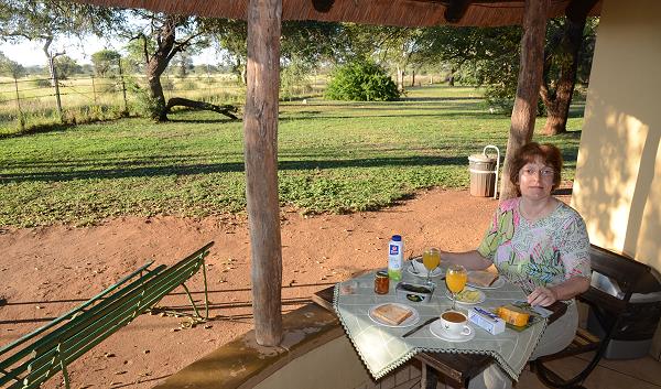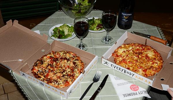 Wir konnten an einem Abend nicht widerstehen und nach dem Game Drive hielten wir vor der Rezeption an und suchten eine Pizza aus. Während Michael noch darauf wartete, lief ich schnell zu unserem Bungalow, deckte den Tisch und machte den Rotwein auf. Danach genossen wir die heiße, leckere Pizza. Das muss man sicher nicht jeden Tag haben, aber wenn man mal keine Lust auf Grillen oder Kochen hat ist dies ein schöner Luxus. Unten ist ein Foto davon zu sehen.