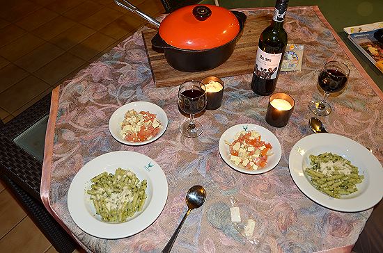 Hier in Biyamiti hat man nun nicht nur Stromanschluß, sondern auch einen nagelneuen Kühlschrank mit Eisfach in der Küche. Dazu einen Toaster und eine Mikrowelle. Der Herd wird noch mit Gas betrieben und hat einen Backofen. Wir haben in Biyamiti aber nur noch die Reste von unseren Vorräten gegessen. Unten auf dem Foto gab es Nudeln mit Pesto, dazu Tomatensalat mit Zwiebeln und Schafkäse und einen empfelenswerten Rotwein aus dem Shop in Lower Sabie: "the den" Cabernet Sauvignon von Painted Wolf Wines.
