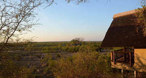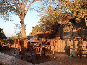 Die Lodge ist auf Stelzen erbaut, direkt unterhalb großer Felsen und die Häuser sind mit einem ebenso hochgelegten Galerie verbunden. Dieser Gang hat eine Schatten spendende Überdachung und ist zum Berg hin mit Gittern abgeschirmt, damit keine grösseren Tiere in den Aufenthalsbereich kommen. Der Grillplatz liegt malerisch außerhalb dieser Abtrennung und bietet viel Platz und Flutlicht am Abend. Beeindruckend ist das Haus mit dem öffentlichen Bereich: Man parkt darunter, geht eine Treppe hoch und durch ein Tor. Dann befindet man sich auf der großen Terrasse mit Sitzgelegenheiten und direktem Blick auf das hauseigene Wasserloch. Die Abtrennung in diese besteht aus Glasscheiben mit eingeritzten Tiermotiven, eine praktische Ablage für den Sundoner und das Fernglas befindet sich an den Seiten. Von hier hat man auch einen Blick auf den ausgehöhlten und mit Wasser gefüllten Stein, in dem den ganzen Tag diverse Vögel Baden und Trinken.