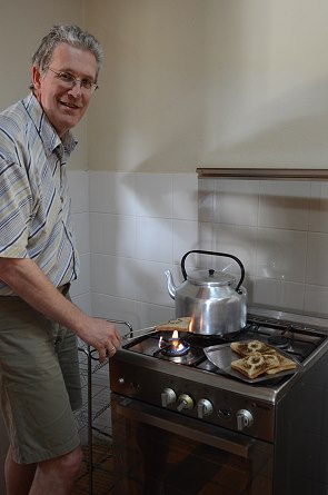 In der Küche stehen ein Gasherd, ein Kühlschrank und ein Gefrierschrank. Dessen Elektronik war leider etwas defekt und gab alle paar Minuten ein Piepen von sich, was etwas nervte - vor allem da wir ihn nur für Eiswürfen brauchten. Nach einer Weile haben wir es aber gar nicht mehr wahrgenommen. In den Schränken findet man alles an Geschirr und Besteck was man braucht in vielfacher Stückzahl. Alleine der Wasserkessel für Kaffe und Tee kann eine ganze Armee versorgen. Unten auf dem Foto ist er zu sehen, mit der Grillzange haben wir den Toast geröstet das es ja ohne Strom auch keinen Toaster gibt. Das ergab nette Muster.