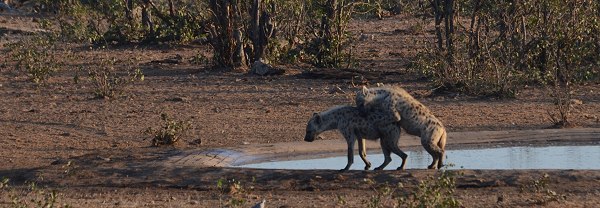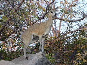 Tagsüber kommen Vögel zum Bird Bath und wir sahen flinke Hörnchen, Klipspringer auf den Felsen und sogar einen scheuen Sharpe´s Grysbok. Am Wasserloch komnnten wir in der Dämmerung Hyänen und einen seltenen Streifenschakal beobachten. Tagsüber kamen Elefanten, Fischadler, Warzenschweine und Büffel an das Wasserloch.