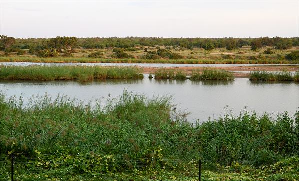 Durch die Regenzeit war der Fluss etwa doppelt so breit wie im Oktober, und die vielen Hippos und Elefanten, die wir noch gut in Erinnerung hatten, ließen sich nicht blicken. Nur zwei einzelne Hippos suhlten sich im Teich direkt vor dem Camp. In einem Teil des Flusses stromaufwärts an den Aussichtspunkten lag noch eine weitere Hippo-Familie im Wasser. Die großen Tiere konnten sich jetzt nach Lust und Laune in der Landschaft verstreuen und waren nicht auf den natürlichen Teich vor dem Camp angewiesen.
