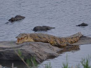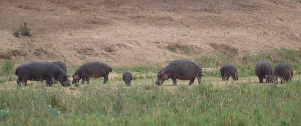 Der Letaba ist durch eine natürliche Felsstufe vor dem Camp ein wenig aufgestaut und an den Ufern gibt es Grasflächen. Idealer Lebensraum für Hippos, die hier ihr Revier haben. In der Nacht hört man sie grunzen und streiten, wenn sie zum Grasen das Wasser verlassen. Wir hatten Glück und in der Nacht zog ein schweres Gewitter über das Camp. Die Hippos haben das scheinbar geahnt und kamen bei bedecktem Himmel schon am Nachmittag zum Grasen ans Ufer, ein eher seltener Anblick. Im Wasser leben auch Krokodile, das große Exemplar unten auf dem Foto sonnte sich in der Sonne.
