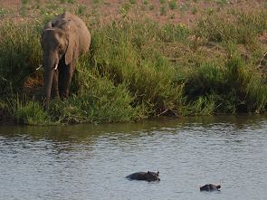 Besonderes Glück hatten wir hier auch mit Elefanten, täglich kamen mehrmals große Herden zum Trinken ans Flussufer und auch ziemlich nah an den Begrenzungszaun, wie unten auf dem Foto zu sehen ist. Sogar ganz junge Rüsselträger konnten wir beobachten, unten auf einem der Videos zu sehen. Mehr Erlebnisse aus diesem Csmp findet Ihr auf der zweiten Seite.
