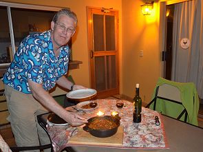 Die Häuser sind komfortabel eingerichtet. Wir hatten Glück und bekamen Haus Nummer 4 zugeteilt, das lag in vorderster Front zum Zaun ohne direkte Nachbarn. Von der Küche zum Essbereich auf der Veranda gibt es eine Durchreiche, jedes Haus hat zudem natürlich auch einen Grillplatz. Die Veranda ist durch Glasscheiben an der Seite windgeschützt, so dass man es hier auf den bequemen Polstersesseln sehr gut aushalten kann. Es gibt im Inneren ein Schlafzimmer mit 3 Einzelbetten, ein weiteres mit Doppelbett, ein Bad mit Toilette, ein extra Duschbad und eine weitere Toilette. Für noch größere Familien steht noch ein Haus mit 3 Schlafzimmern zur Wahl.